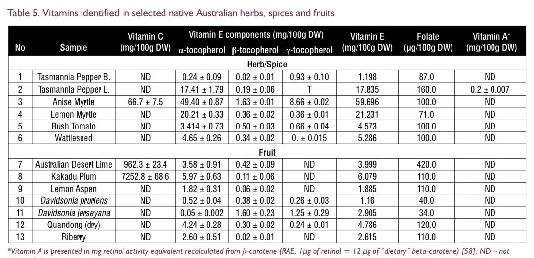 Vitamin A levels in Australian native fruits are found to be lower than other vitamins. With only Davidson’s plum and quandong were found to contain vitamin A in 13 and 10 mg/100 g retinol equivalents, respectively.