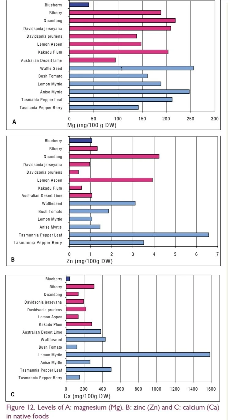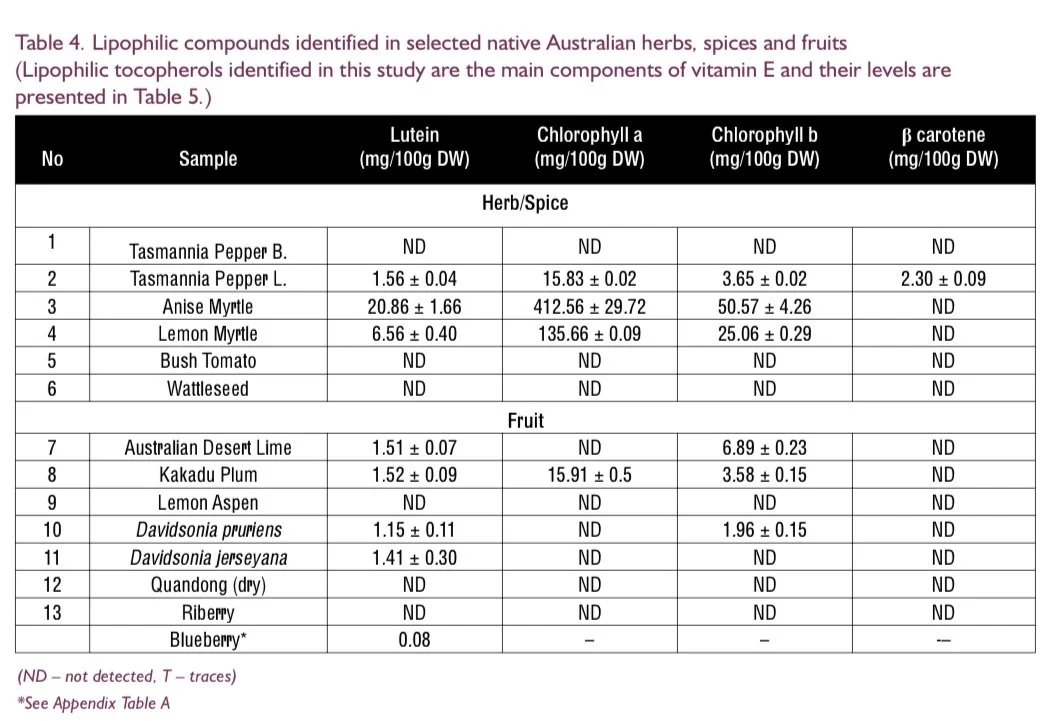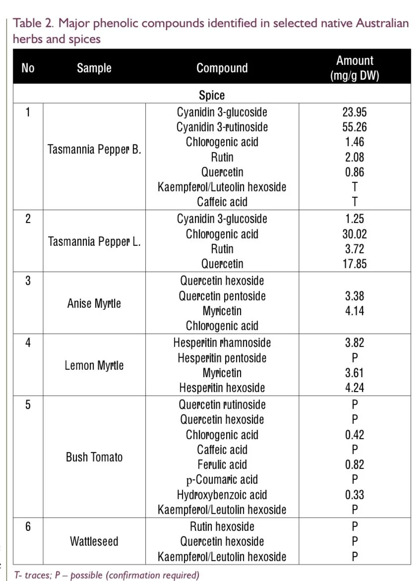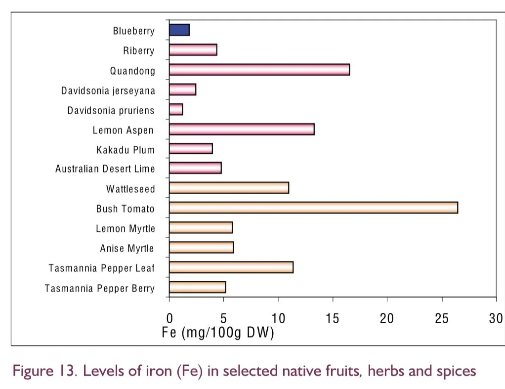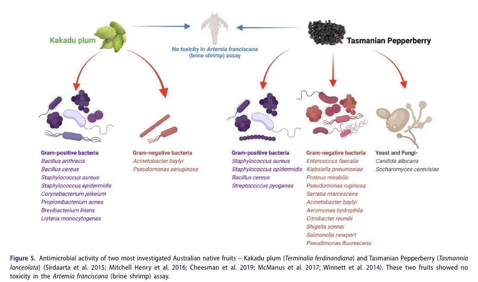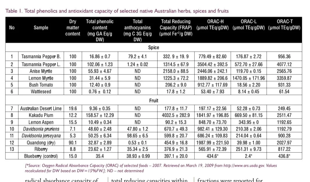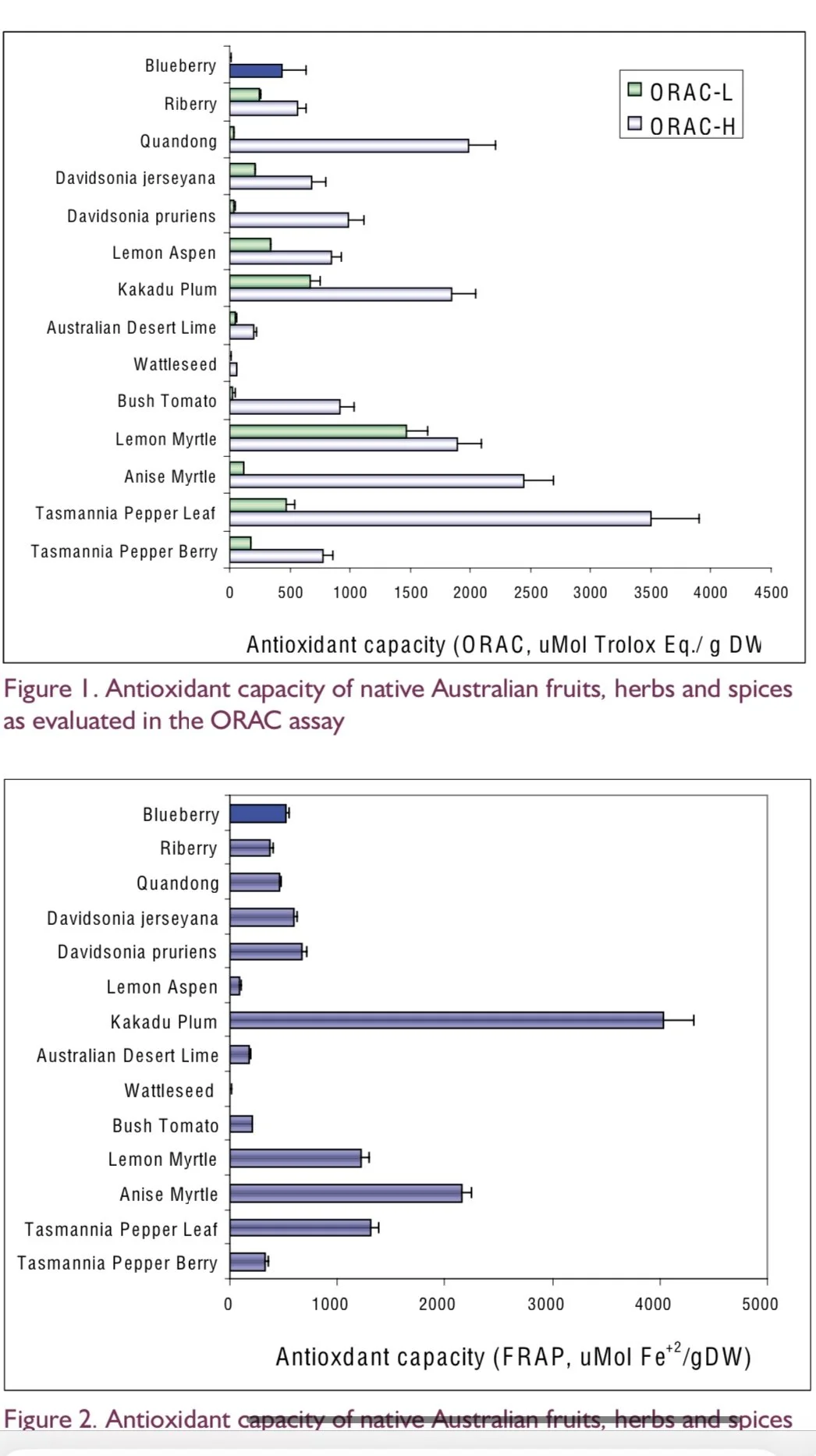 Antioxidant capacity- Kakadu plum ( at least 8x blueberries) and Tasmanian Pepper leaf
