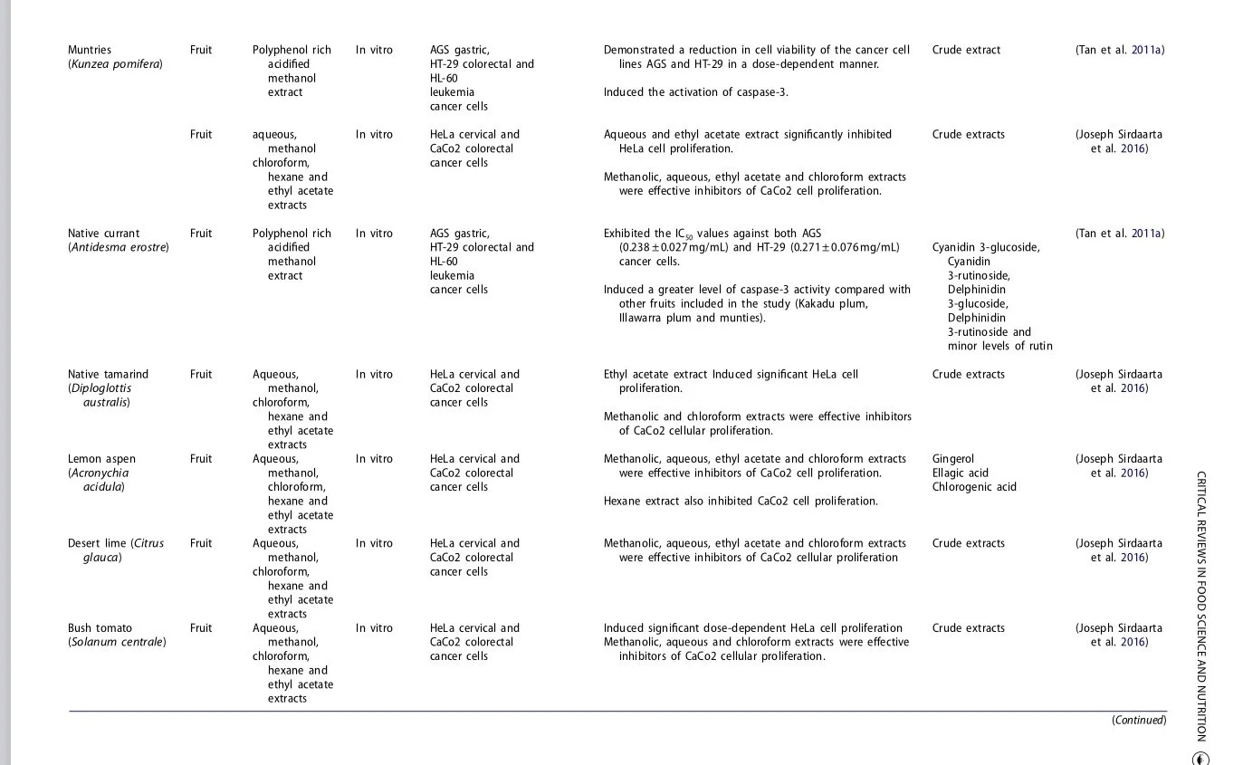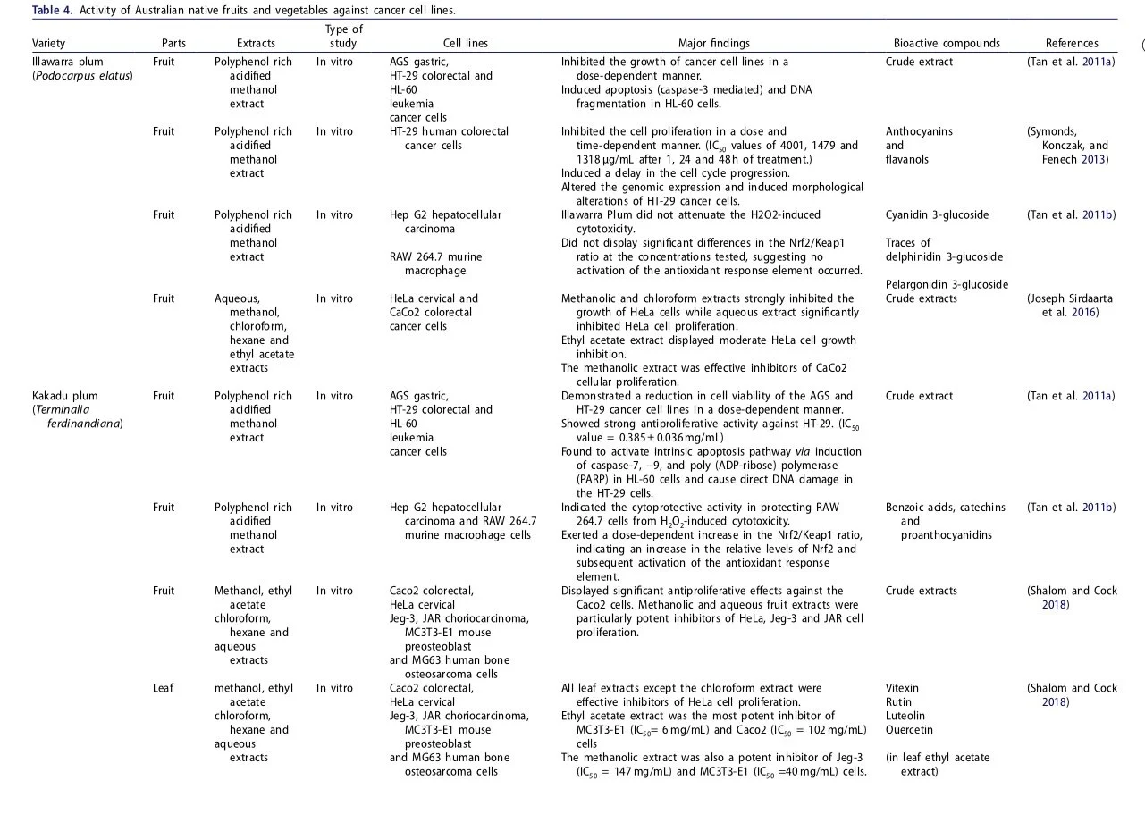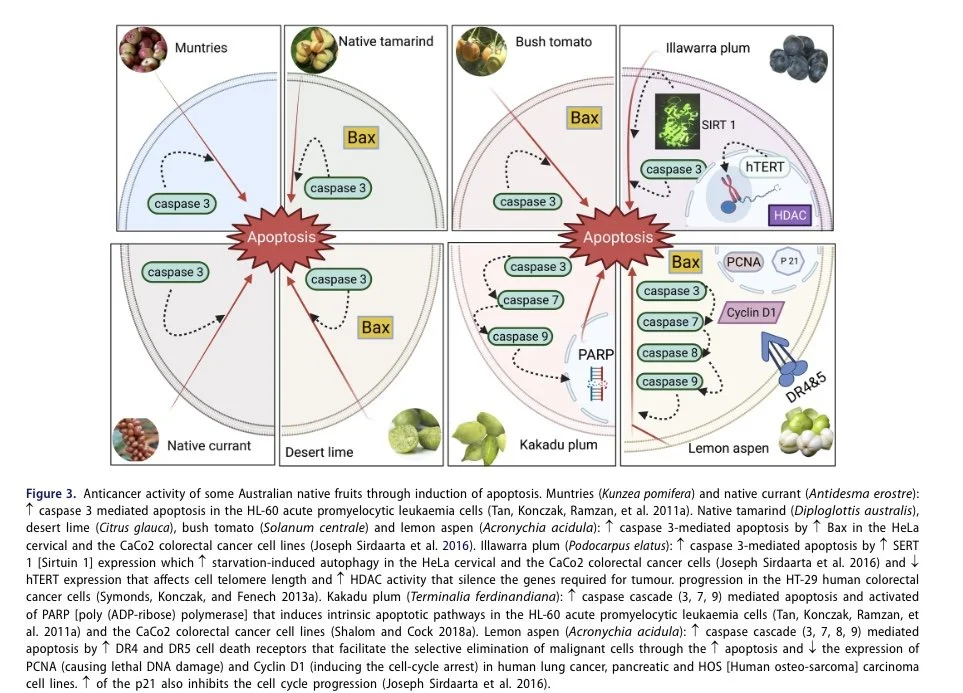 The in vitro studies described demonstrate that phytochemicals in Australian native fruits and vegetables naturally act as antioxidants to reduce cellular oxidative stress, disrupt proliferative signaling, and induce the cell cycle arrest leading to apoptosis in a wide range of cancer cell lines.