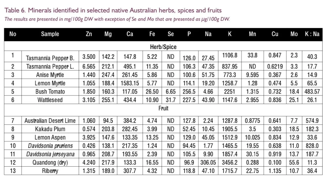 Native fruits are notable for their calcium concentration and possess higher concentrations of the trace elements iron, copper, and zinc compared to Western fruits (Brand and Cherikoff Citation1985). Kakadu plum, for instance, is particularly high in minerals including magnesium, zinc, calcium, potassium, sodium, iron, phosphorus, manganese, copper, and molybdenum, and has shown high potassium:sodium ratio. Riberry was found to have a high calcium content.
