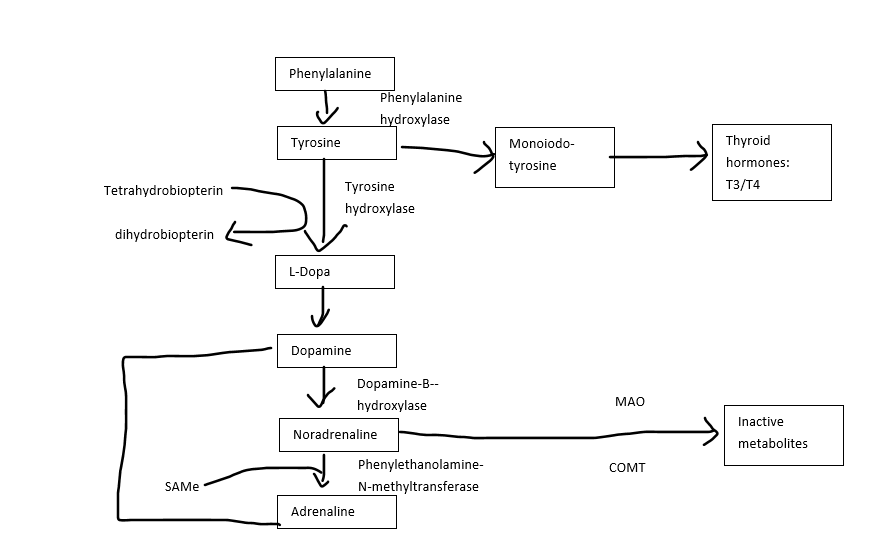Adrenal Medulla: produces Adrenaline, Nor-adrenaline (Tyrosine derived)